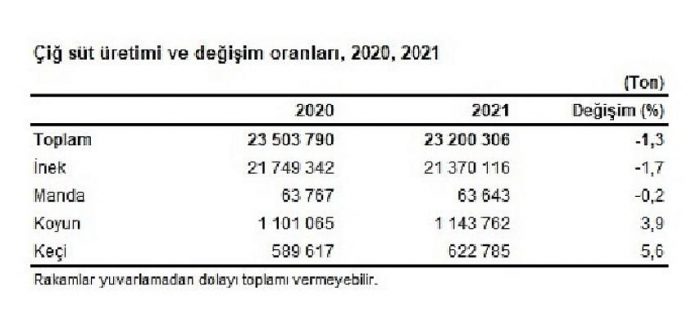 2020 yılında 23 milyon 503 bin 790 ton olan çiğ süt üretim varsayımı, 2021 yılında 1,3 azalarak 23 milyon 200 bin 306 ton oldu. Bir evvelki yıla nazaran keçi sütü üretimi 5,6, koyun sütü üretimi 3,9 artarken; inek sütü üretimi 1,7, manda sütü üretimi ise 0,2 azaldı.