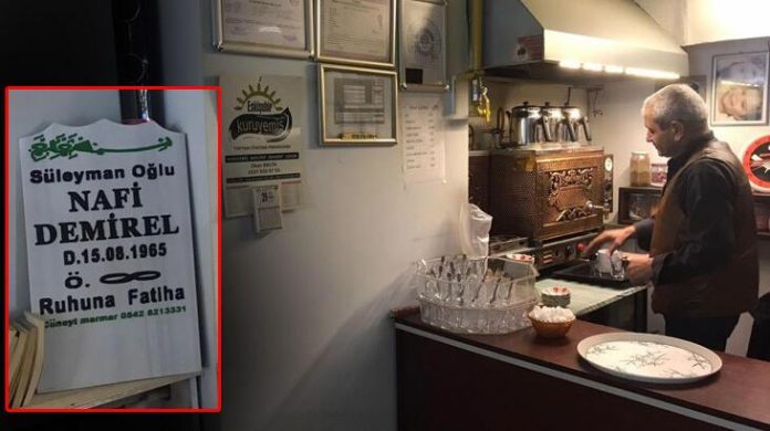 Mezar taşını yaptırmaya karar verdiği hikaye hakkında konuşan Nafi Demirel, “Hikayesi biraz ilginç gelecek ama bir gün evimde uyurken, rüyamda kendi mezarımı gördüm. Mezar tahtam çürümüş, ismim belli değildi. Rüya ya bu, ben de kalktım ve mezar taşının tahtasına tekme attım. Ertesi gün de bu mezar taşını yaptırmayı düşündüm ve yaptırdım. Şimdi bunu çay ocağında başköşeye aldım ve gözüm gibi de bakıyorum. Bazı arkadaşlar ‘neden yaptırdın bunu’ diye soruyorlar. Ben de espri mahiyetinde, ‘Mermere zam gelecekmiş, gelmeden yaptırayım da hazır dursun. Arkamdakilere yük olmayayım’ diyorum. Müşteriler de çok ilginç buluyorlar. Ben kötü bir şey olmadığını, ters çevirince tezgah olarak bile kullanılabileceğini söylüyorum. Onlar ‘acelen neydi’ diyorlar. Bazen ben de ‘baktığım zaman ölüm olduğunu hatırlıyorum’ diyorum. Kimisi gülüyor, kimi üzülüyor” dedi.