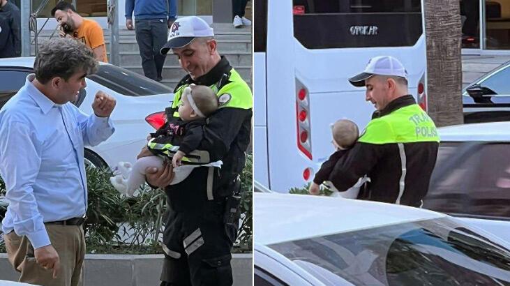Bu sırada caddede görevli olan Trafik Şube Müdürlüğü polis memuru Emre Y., durumu fark ederek anne-kızın bulunduğu aracın yanına gitti. Bebeği kucağına alan Emre Y., bir süre oyaladı. Emre Y., aracını park alanından çıkaran anneye bebeği teslim etti. Durumu fark edip cep telefonuyla kaydeden çevredekiler, polis memuruna teşekkür etti.