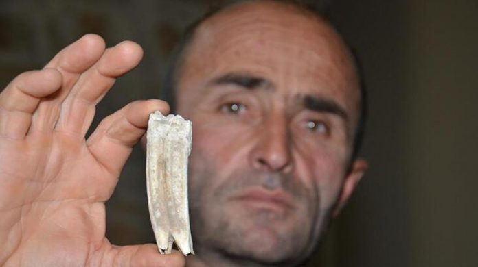 Elbistan’a bağlı Büyükyapalak Mahallesi’nde kuzu otlatan Yemliha Yılmış, sulama hattı için kazılan çukurda, dişe benzeyen bir obje olduğunu fark etti. Tarihe meraklı olan Yılmış, üzerindeki toprak kalıntılarını temizledikten sonra yaptığı incelemede bulduğu şeyin bir hayvana ait diş olduğunu anladı.