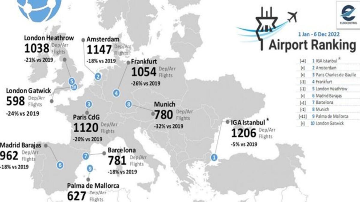Avrupa Hava Seyrüsefer Emniyet Teşkilatı (EUROCONTROL) tarafından 01 Ocak – 06 Aralık 2022 dönemi ‘Kapsamlı Değerlendirme Raporu’ yayınlandı. Rapora göre belirtilen tarihlerde günlük ortalama bin 206 uçuş ile İGA İstanbul Havalimanı Avrupa’nın en yoğun havalimanı oldu. İGA İstanbul Havalimanı yılın ilk 11 ayında 59 milyondan fazla yolcuya ev sahipliği yaptı. Bu yılın 11 ayında iç hatlarda 100 bin 950, dış hatlarda 287 bin 511 olmak üzere toplamda 388 bin 461 uçak trafiğinin gerçekleştiği İGA İstanbul Havalimanı ,Avrupa’daki havalimanları arasında ilk sırada yer aldı. Avrupa Hava Seyrüsefer Emniyet Teşkilatı’nın (EUROCONTROL) istatistiklerine göre; günde ortalama bin 206 uçuş gerçekleştiren İGA’yı, bin 147 uçuş ile Amsterdam Schiphol Havalimanı ve bin 120 uçuş ile Paris-Charles de Gaulle Havalimanı takip etti. Sivil Havacılık Genel Müdürlüğü’nün sosyal paylaşım sitesinden yapılan açıklamaya göre ise ’’ İstanbul Havalimanı günlük ortalama bin 206 uçuş ile Avrupa’daki en yoğun havalimanı oldu. Antalya Havalimanı ise günlük ortalama 545 uçuş ile Avrupa’daki en yoğun 20 havalimanı içerisinde yer aldı‘‘ ifadelerine yer verildi.