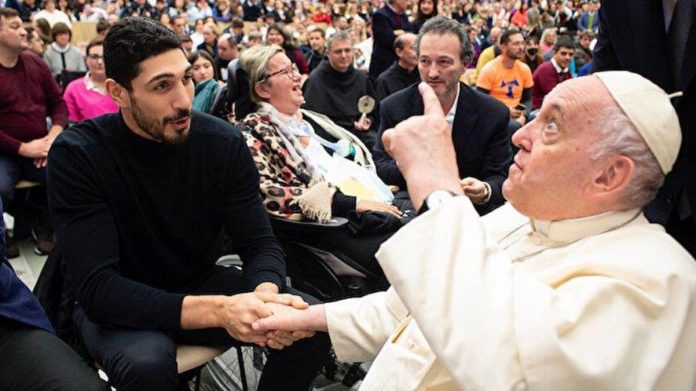 ETÖ lideri Fethullah Gülen’in manevi oğlu Enes Kanter, Vatikan’da Katoliklerin ruhani lideri ve Vatikan Devlet Başkanı Papa Franciscus ile bir araya geldi. Söz konusu ziyaretini, sosyal medya hesabı Twitter’dan paylaşan Kanter, Papa’ya Türkiye’yi şikayet etti.