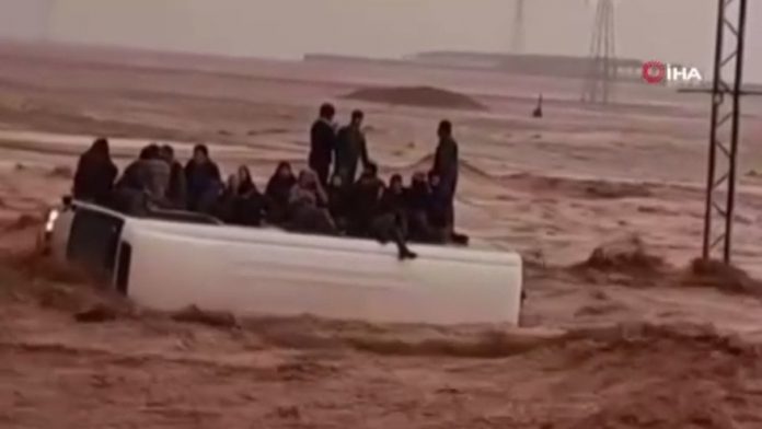 Otobüsteki yolcular sel sularının ortasında mahsur kalırken, devrilen otobüsün üzerine çıkarak yardım bekledi.