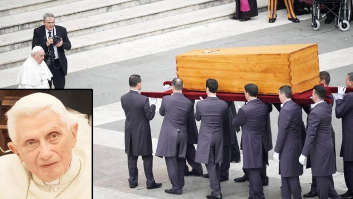 Aziz Petrus Meydanı’nda düzenlenen cenaze törenini binlerce kişi izledi. Benedikt’in 600 yıl sonra istifa eden ilk papa olması nedeniyle, modern zamanlarda ilk kez görevdeki bir papa selefinin cenaze merasimine liderlik etmiş oldu. Töreni on binlerce kişi izledi. Papa Françesko’nun liderlik ettiği cenazeye İtalya ile eski papanın memleketi Almanya’dan heyetler resmi olarak katıldı. Öte yandan İspanya Kraliçesi Sofia, Belçika Kralı Philippe ve Kraliçesi Mathilde ile Macaristan, Polonya, Portekiz, Slovenya gibi ülkelerden devlet liderleri de özel sıfatla törende hazır bulundu. Eski Papa’nın naaşı, geleneklere göre özel şerit ve mühürlerle kapatılarak iç içe üç ayrı tabuta konuldu ve Aziz Petrus Bazilikası’nın alt katındaki mezar odalarından birine defnedildi. Benedikt’in naaşı pazartesi gününden dünkü törene kadar bazilikada ziyarete açılmıştı. Vatikan’ın açıklamasına göre 3 gün içinde eski papayı katafalkta yaklaşık 200 bin kişi ziyaret etti.