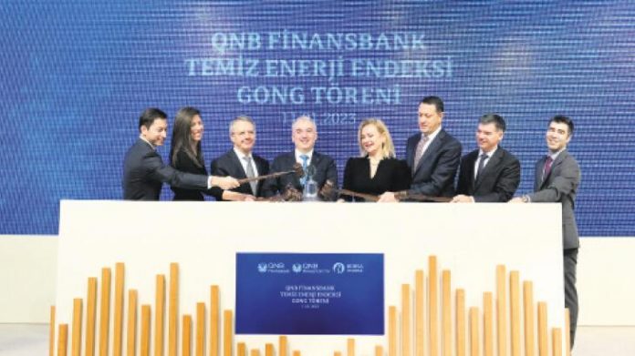 QNB Finansbank Temiz Enerji Endeksi, dün Borsa İstanbul’da gerçekleşen gong töreni ile kamuoyu ile paylaşıldı. Törene, Borsa İstanbul A.Ş. Genel Müdürü Korkmaz Ergun, QNB Finansbank Yönetim Kurulu Başkanı Ömer Aras, QNB Finansbank Genel Müdürü Ömür Tan, QNB Finansportföy Yönetim Kurulu Başkanı Enis Kurtoğlu, QNB Finansportföy Genel Müdürü Egemen Erden ve QNB Finansbank Sürdürülebilirlik Komitesi Başkanı Yeliz Ataay Arıkök katıldı.