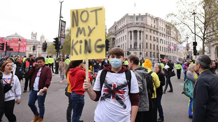 Kral III. Charles’ın taç giyme töreninde gerçekleştirilen geçit töreni güzergahında bir araya gelen eylemciler “Benim Kral’ım değil” sloganları attı. Gösteriye müdahale eden polis, monarşi karşıtı Republic (Cumhuriyet) adlı grubun lideri Graham Smith ile 51 göstericiyi gözaltına aldı.