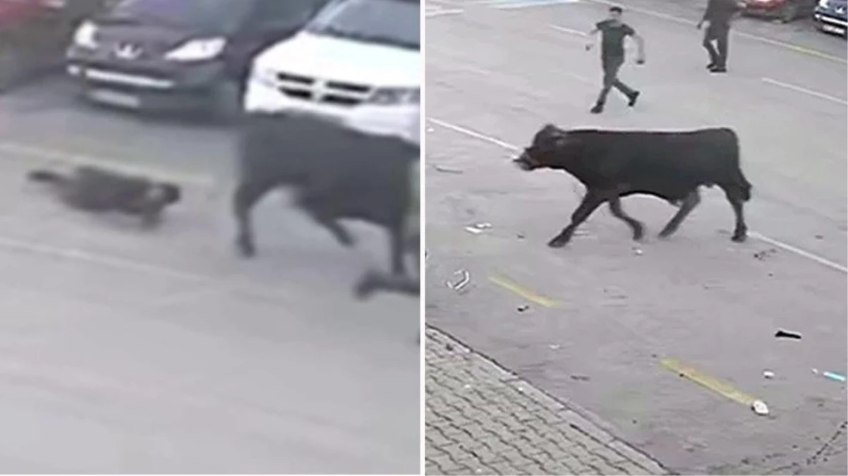 Boğa, bir otomobil tamirhanesine girdi. Boğayı görünce panik yaşayan müşterilerle çalışanlar, sağa sola kaçıştı. Kıstırılan boğa yakalanırken, yaşananlar iş yerinin güvenlik kameralarına yansıdı.