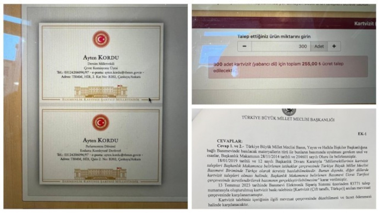Yeşiller ve Sol Gelecek Partisi (Yeşil Sol Parti) Tunceli Milletvekili Ayten Kordu, 12 Temmuz’da elektronik sipariş yöntemi ile Meclis Basımevi’ne bin adet Meclis binası ve amblemi yanı sıra Milletvekilinin isminin ve soy isminin yer aldığı kartvizit başvurusunda bulundu.