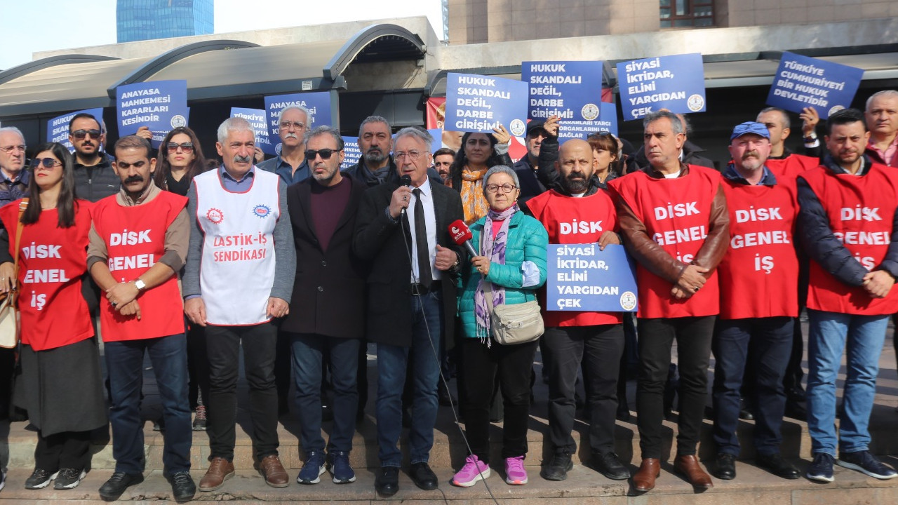 Ardından söz alan DİSK Genel İş İzmir 6 Nolu Şube Yönetcisi Değer Yıldız da iktidarın tek derdinin kendi düşüncelerine uygun hareket etmek olduğunu ifade ederek, “Bu hukuksuzluğa karşı çıkmak ise herkesin görevidir” ifadelerini kullandı.