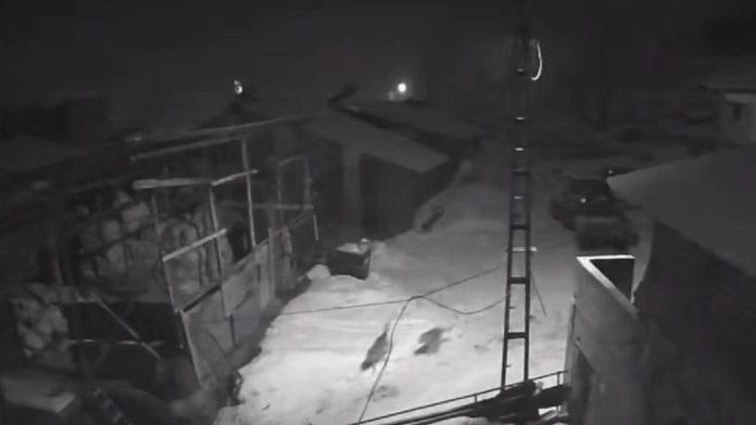 Kurtların evlerin arasında dolaşıp yiyecek aradığı anlar çevredeki güvenlik kamerası görüntülerine yansıdı. (HABER MERKEZİ)