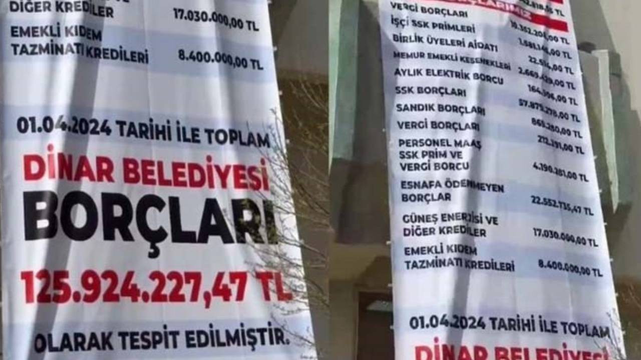 Afyon Postası’nın aktardığına göre, Dinar Belediyesi’nin duvarına asılan listede belediyenin kasasındaki toplam varlık ve borçlar bulundu. Belediyenin borçları arasında vergi borçları, işçi SSK primleri, esnafa ödenmeyen borçlar ve personel maaşları gibi borçlar yer aldı.