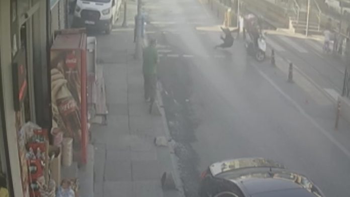 DHA’nın haberine göre yolun karşısına geçmek için kaldırımda bekleyen kadın, yayalara kırmızı ışık yandığı sırada karşıya geçmeye çalıştı. Bu sırada seyir halinde olan motosiklet sürücüsü kadına çarptı. Çarpmanın etkisiyle kadın yere savrulurken, motosiklet sürücüsü ise, tramvay yoluna düştü.