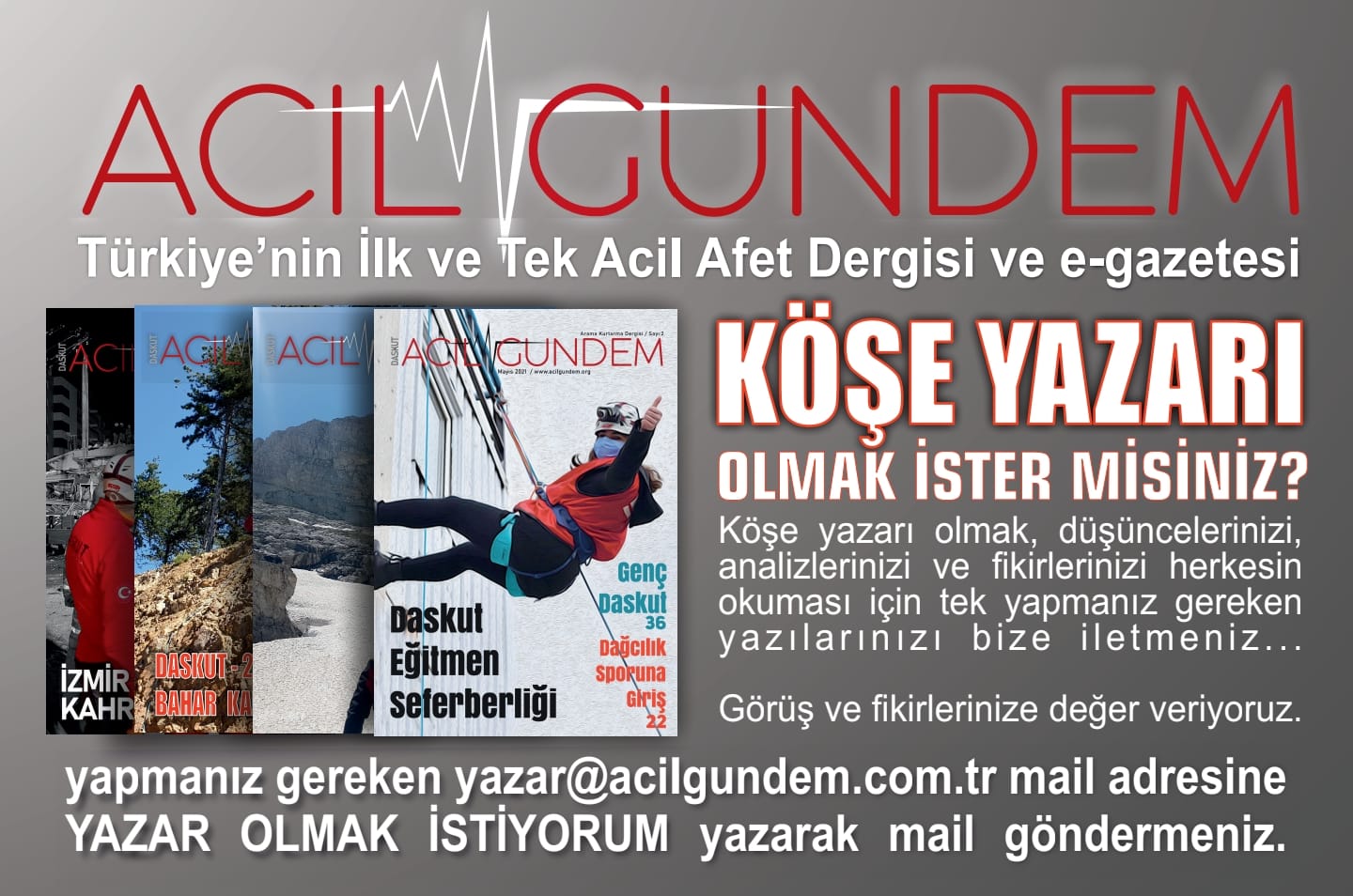 Tek yapmanız gereken makale ve yazılarınızı ve görsellerinizi  haber@acilgundem.com.tr mail adresine göndermeniz yeterli…