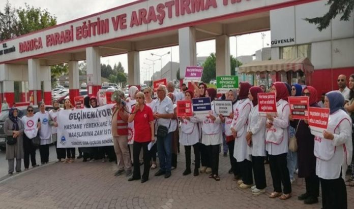 Kocaeli Darıca’da bulunan Farabi Eğitim ve Araştırma Hastanesi önünde DİSK Gıda-İş Sendikası üyeleri, yemekhane personellerinin talepleri için hareket yaptı.