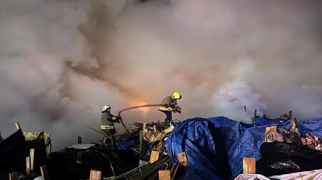 Alevler, yaklaşık 500 metrekare alanda bulunan ahşap ürünlerin tamamını sardı.