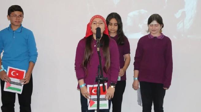Fatih Sultan Mehmet Ortaokulu’nda “Filistin’de çocuk olmak” isimli program düzenlendi. Öğrenciler, Filistin’e destek konulu şiirler okuyup, oratoryo gösterisi yaptı.