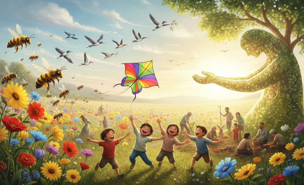 Arıları, kuşları, çiçekleri,